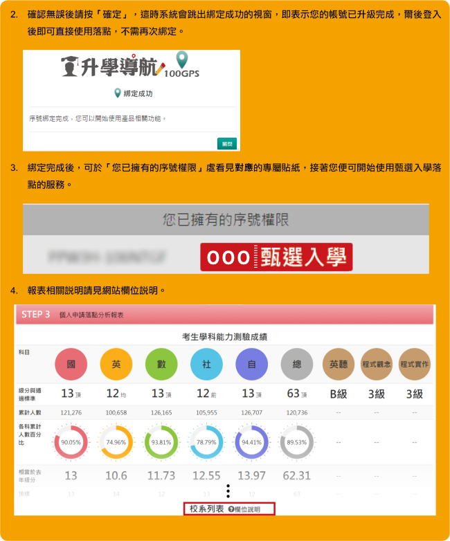 )乙組會員權限,學生可至網站輸入學校模擬考成績,即可依自己喜好點選個人申請、繁星推薦、四技申請、軍校甄選以及警大考試等五大甄選,觀看其模擬落點分析報表,甚至可在114年學測結束官方公布答案後,利用預測的學測成績先行預估自己的落點。