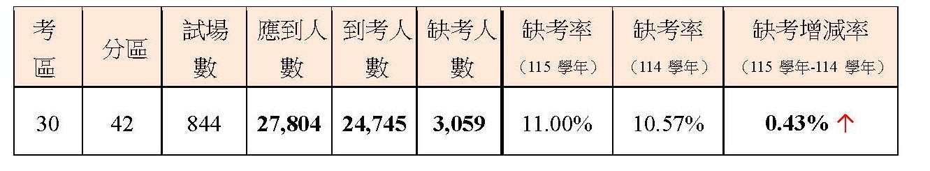 115學年第二次考試英聽測驗應到27,804人(含身心障礙及重大傷病考生167人),實到24,745人,缺考3,059人,缺考率11.00%,較114學年同場次缺考率(10.57%)增加 0.43%。
