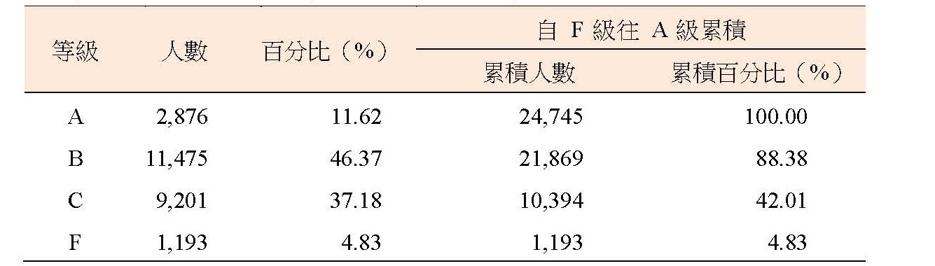所有到考考生24,745人之成績等級分布百分比:A級11.62%、B級46.37%、C級37.18%,F 級4.83%。