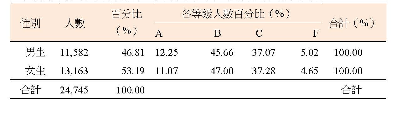 到考考生中,男生占 46.81%,女生為 53.19%,男女考生在成績等級的分布差異不大;其中男生在A級、F級的人數百分比高於女生,女生則在B級、C級高於男生。