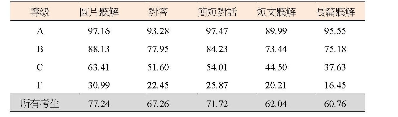 圖片聽解約七成七,簡短對話約七成二,對答約六成七,短文聽解約六成二,長篇聽解約六成一。