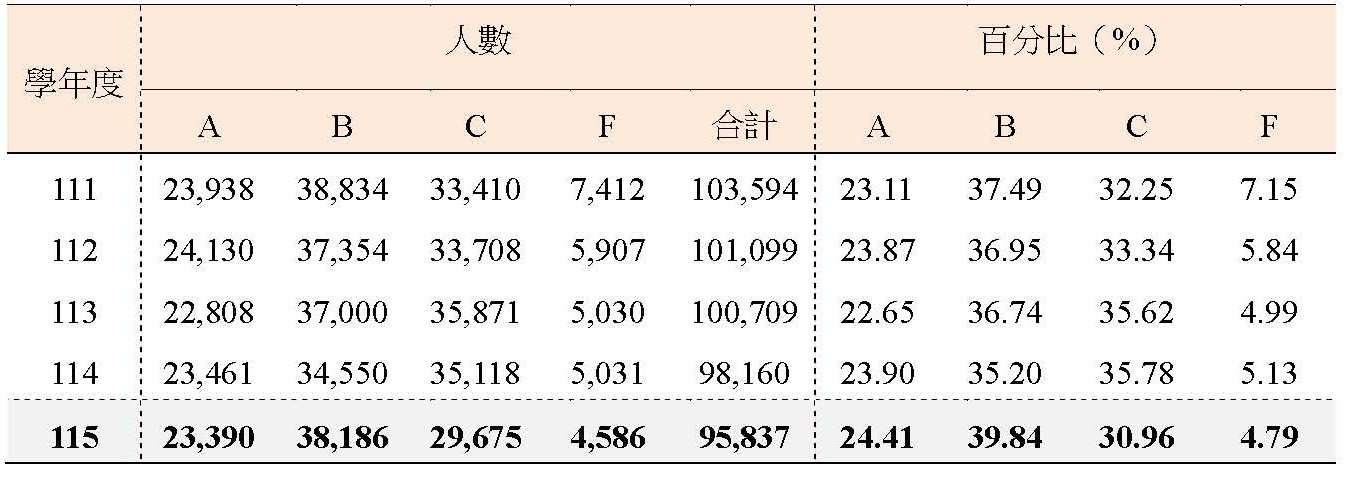 下表呈現111至115年各學年英聽測驗擇優成績各等級人數及百分比。115學年兩次考試經成績擇優後,95,837位考生成績等級分布:A級24.41%、B級39.84%、C級30.96%、F級4.79%。近五學年度擇優後成績各等級百分比接近,其中A等級與B等級百分比合計約為六成左右。