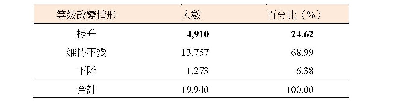 115學年兩次英聽測驗的重複到考考生19,940人中,於第二次考試成績等級提升者占 24.62%;維持不變者占 68.99%;下降者占 6.38%。